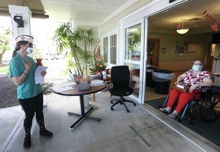 Deb Lewis, state senior vice commander of the Hawaii Veterans of Foreign Wars, and John Hiduchick with VFW 3830, presented Valentine’s Day cards to residents to Yukio Okutsu State Veterans Home on Friday afternoon.