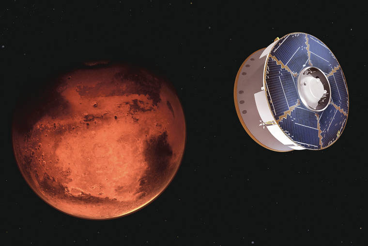 This illustration provided by NASA depicts the Mars 2020 spacecraft carrying the Perseverance rover as it approaches Mars. Perseverance's $3 billion mission is the first leg in a U.S.-European effort to bring Mars samples to Earth in the next decade. (NASA/JPL-Caltech via AP)