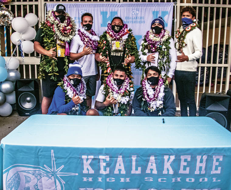 Eight Kealakehe seniors were able to ensure the anti-climactic cancelation of the 2020 high school football season, however, would not spell the end of their athletic careers. At the Old Airport pavilion in Kailua-Kona, seven Waverider football players signed their letters of intent Wednesday to continue their academic and athletic careers at the next level, while one other signed his during a virtual ceremony on Feb. 3.