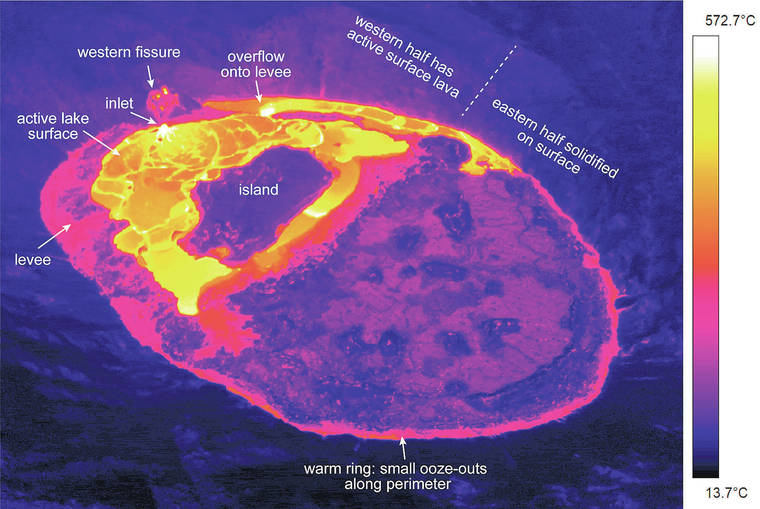 As lava continued to erupt from the west vent, the active western portion of the lava lake built up perched levees above the stagnant eastern surface crust. The active lava lake remains perched above its base by several meters or yards.