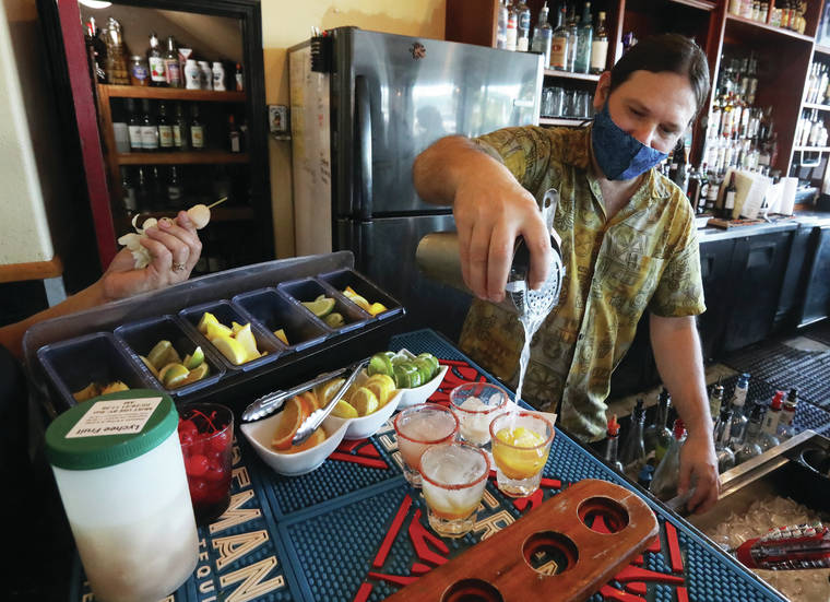 Kelsey Walling/Tribune-Herald David Pilla pours drinks for a margarita flight Tuesday while working the bar at Pineapples in Hilo.