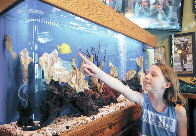 A child points to a yellow tang in a fish tank at Quinn’s aquarium in this 2019 file photo. The Pet Industry Joint Advisory Council has released a revised draft environmental impact statement with a new proposal to reopen West Hawaii’s coastal waters to commercial aquarium fishing. Under the updated proposal, only yellow tang, kole, orangespine unicornfish, potter’s angelfish, brown surgeonfish, Thompson’s surgeonfish, black surgeonfish and bird wrasse would be allowed to be caught. Laura Ruminski / West Hawaii Today