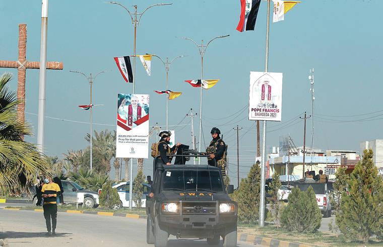 Iraqi security forces pass by Vatican flags and posters Monday announcing the visit of Pope Francis on a street in Qaraqosh, Iraq. (AP/Photo/Hadi Mizban)