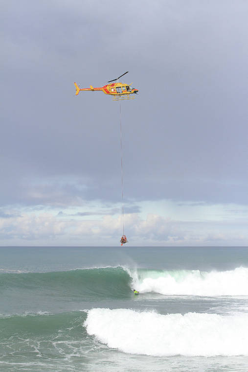 A Hawaii Fire Department helicopter lifts a stranded surfer and a fire rescue swimmer to shore at Hapuna Beach as a boogie boarder rides a wave below it in 2015. A bill that would allow and in some cases require government entities seek reimbursement for search and rescue costs unanimously passed its second assigned committee Wednesday. (Patrick O'Leary/Special to West Hawaii Today file photo)