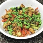 Divide rice, tofu, mushrooms, carrots, zucchini, and edamame among bowls. Garnish with sesame seeds, and serve with ginger-garlic sauce.