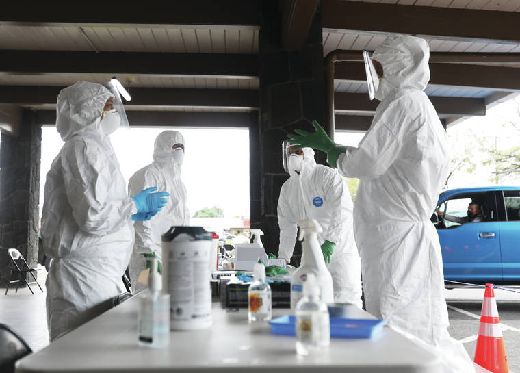 Kelsey Walling/Tribune-Herald COVID-19 testers with S&G Labs prepare to test more people in line at Afook-Chinen Civic Auditorium in Hilo on Wednesday, March 10, 2021.
