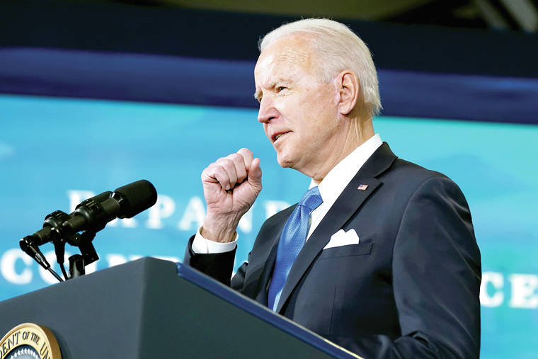 President Joe Biden speaks Tuesday during an event in the South Court Auditorium in the Eisenhower Executive Office Building on the White House Campus, in Washington. (AP Photo/Andrew Harnik)