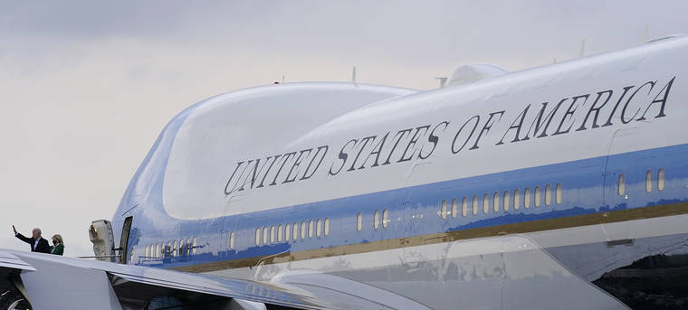 President Joe Biden waves as he and first lady Jill Biden board Air Force One at Ellington Field Joint Reserve Base in Houston, Friday, Feb. 26, 2021. The Bidens are en route to Washington. (AP Photo/Patrick Semansky)
