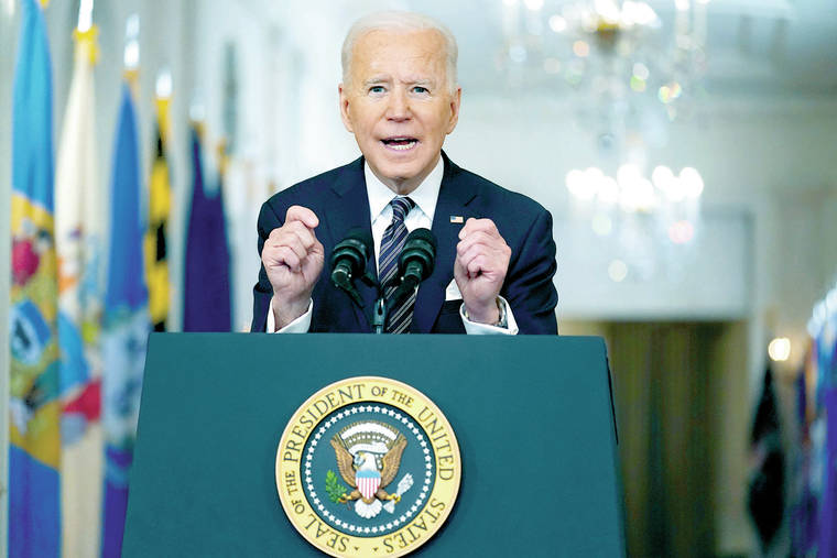 WASHINGTON — One year after the nation was brought to a near-standstill by the coronavirus, President Joe Biden pledged in his first prime-time address Thursday night to make all adults eligible for vaccines by May 1 and raised the possibility of beginning to “mark our independence from this virus” by the Fourth of July. He offered Americans fresh hope and appealed anew for their help.