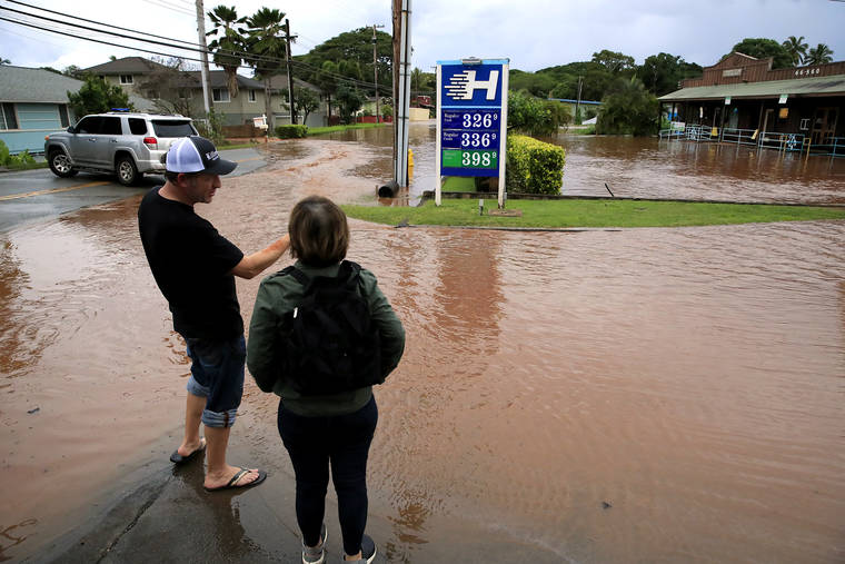 People stand at the edge of floodwaters along Haleiwa Road on Tuesday in Haleiwa, Oahu. Torrential rains have inundated parts of Hawaii for the past several days. (Jamm Aquino/Honolulu Star-Advertiser via AP)
