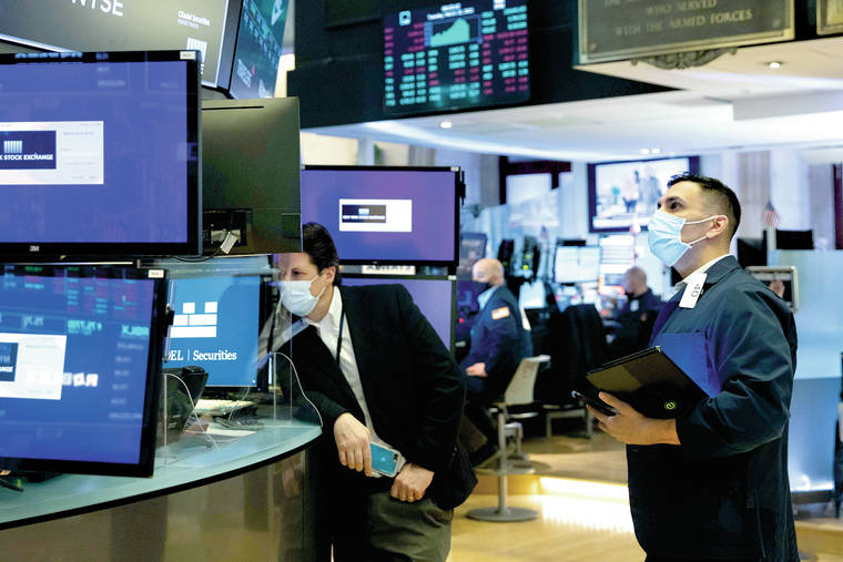 In this photo provided by the New York Stock Exchange, Craig Spector, right, works with fellow traders on the floor, Tuesday, March 16, 2021. Stocks were mixed in afternoon trading Tuesday after Wall Street hit a new high the day before. Investors continue to closely watch the bond market, with even minute changes in bond yields causing stocks to fluctuate. (Colin Ziemer/New York Stock Exchange via AP)