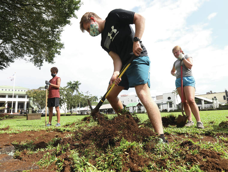 On Tuesday morning, the group worked to clear grass and dirt from Kalakaua Park to help restore the park to its former appearance.