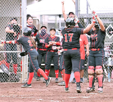 UHH photo UH-Hilo's softball team celebrated two more wins Sunday against Chaminade, improving to 5-0.