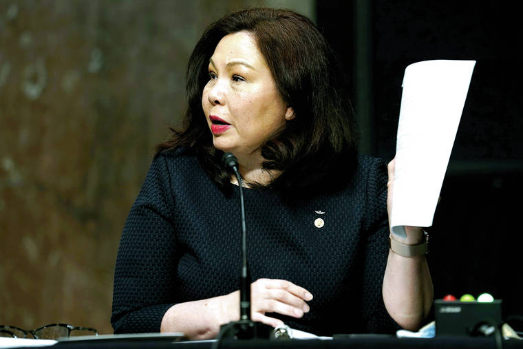 FILE - In this May 6, 2020, file photo, Sen. Tammy Duckworth, D-Ill., speaks during a hearing on Capitol Hill in Washington. Duckworth says the lack of Asian American or Pacific Islander representation in President Joe Biden’s cabinet is “not acceptable” and is threatening to withhold her vote on key nominations until the administration addresses the matter. (Greg Nash/Pool via AP)