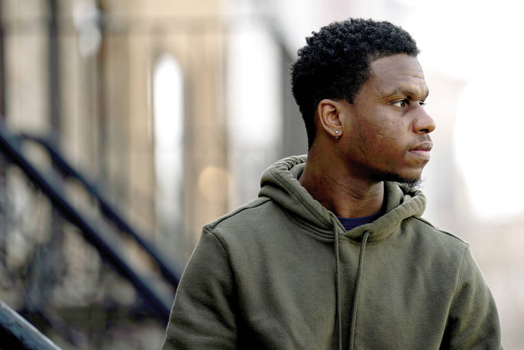 Mikel Haye poses for a portrait on his stoop, Friday, March 12, 2021, in the Brooklyn borough of New York. Haye was forced into performing a financial triage after he lost all three of his part-time jobs shortly after the pandemic struck. He was scrambling to pay the bills on a Brooklyn apartment he shares with his unemployed mother and two brothers while deciding how to spend whatever money was left: On food? The car insurance? His phone bill? (AP Photo/John Minchillo)