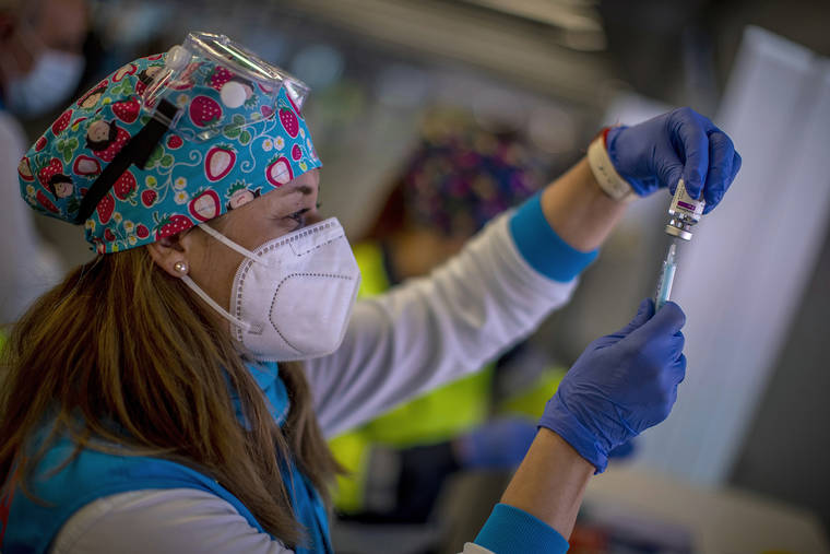 FILE - In this Thursday, Feb. 25, 2021 file photo, a health worker holds a vial of the AstraZeneca vaccine to be administered to emergency services personnel during a mass COVID-19 vaccination campaign at Wanda Metropolitano stadium in Madrid, Spain. AstraZeneca’s release of encouraging data about its coronavirus vaccine from its U.S. trial raised hopes that the drug company could bury doubts about the shot and put a troubled rollout behind it. But just hours later, U.S. officials released an unusual statement expressing concerns AstraZeneca had included “outdated information” from its study and that it may have provided “an incomplete view of the efficacy data.” (AP Photo/Manu Fernandez, File)