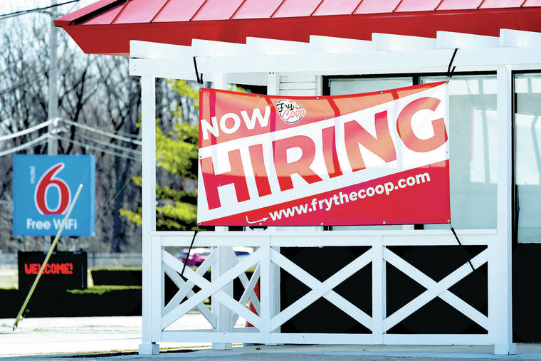 A hiring sign shows outside of restaurant in Prospect Heights, Ill., Sunday, March 21, 2021. The number of people seeking unemployment benefits fell sharply last week to 684,000, the fewest since the pandemic erupted a year ago and a sign the economy is improving. (AP Photo/Nam Y. Huh)