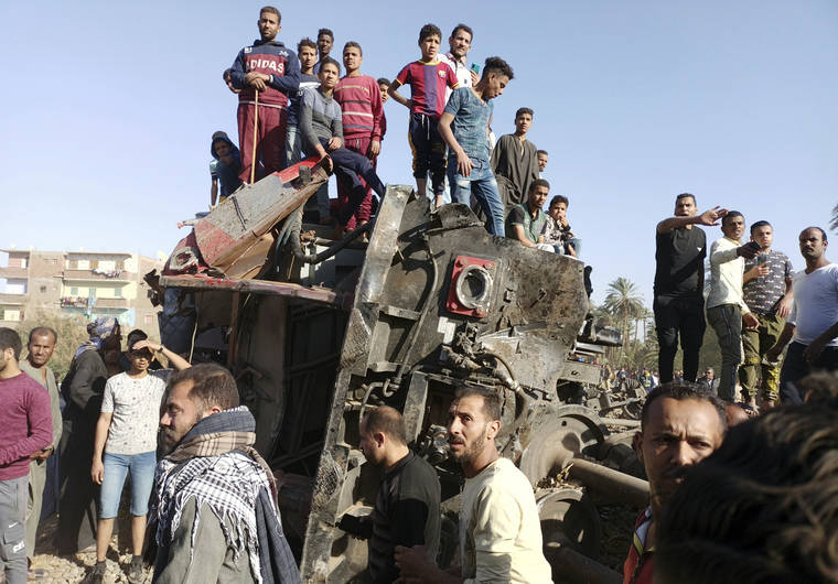 Egyptians gather around mangled train carriages Friday at the scene of a train accident in Sohag, Egypt. (AP Photo)