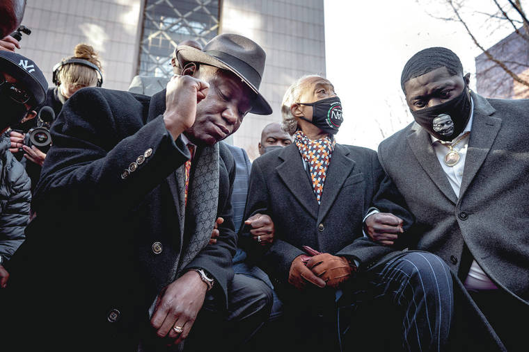 From foreground left, attorney Ben Crump, the Rev. Al Sharpton and Brandon Williams, nephew of George Floyd, take a knee during a news conference Monday at the Hennepin County Government Center in Minneapolis, Minn. (Jerry Holt/Star Tribune via AP)