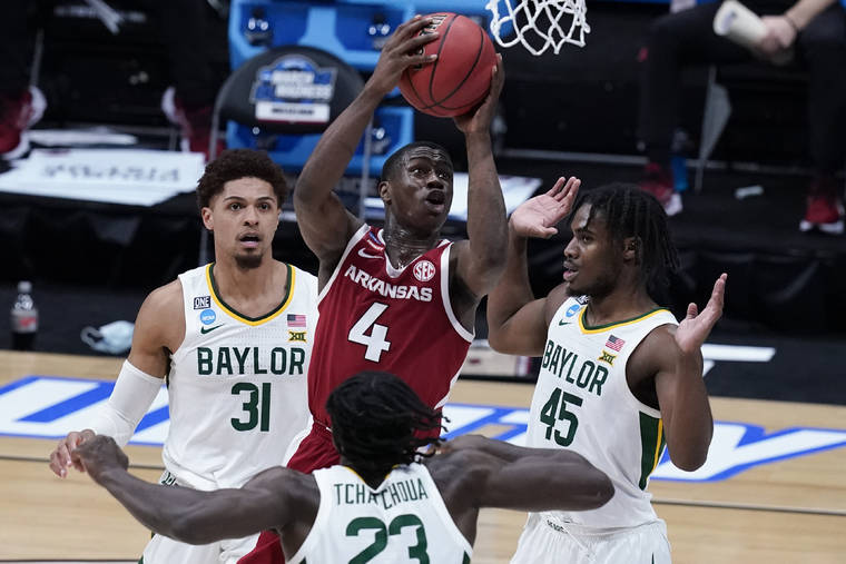 Associated Press Arkansas guard Davonte Davis drives on Baylor guard Davion Mitchell (45) and Jonathan Tchamwa Tchatchoua as MaCio Teague looks on Monday during the Bears' 81-72 win at Lucas Oil Stadium in Indianapolis.