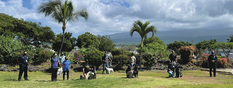 During a ceremony Feb. 25 in Kailua-Kona, the association presented the department with seven canine trauma first aid kits and seven nasal Narcan kits — one for each of the department’s seven canine units. The department has five narcotics canines and two live search canines.