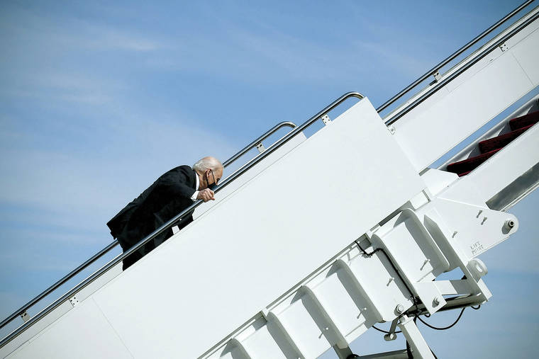 I blame all of this silliness on that classic cliche image of presidents ascending into Air Force One. We’ve all seen it many times. Before beginning his journey up what seems like thousands of stairs, the president turns and waves. Then he jauntily scales the stairs with a confident spring in his step. When he reaches the summit, he turns and waves again before entering the plane. All presidents are expected to execute this basic duty flawlessly.