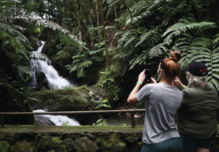 Kelsey Walling/Tribune-Herald Alexandra, left, and Cheryl Bock take photos of Onomea Falls at the Hawaii Tropical Botanical Garden on Thursday, April 8, 2021. The botanical garden reopened for the first time since closing last year.
