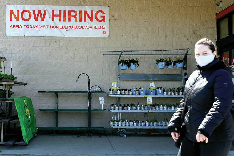 A hiring sign is seen outside home improvement store in Mount Prospect, Ill., Friday, April 2, 2021. The pace of job openings reached the highest level on record in February, a harbinger of healthy hiring and a hopeful sign for those looking for work. (AP Photo/Nam Y. Huh)