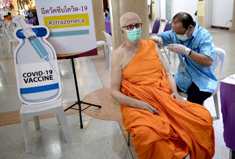 A health worker administers a dose of the AstraZeneca COVID-19 vaccine Friday to a Buddhist monk at Nak Prok Temple in Bangkok, Thailand. (AP Photo/Sakchai Lalit)