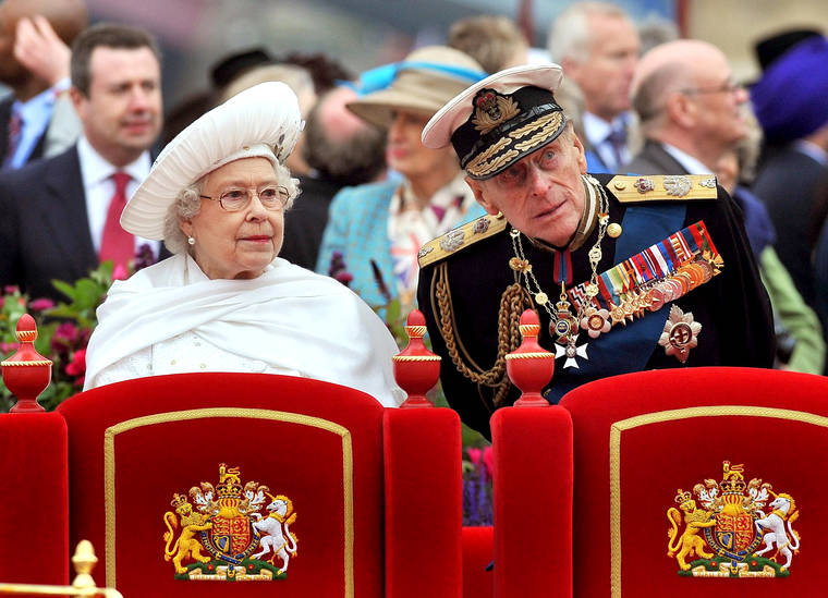 In this Sunday June 3, 2012 file photo, Britain's Queen Elizabeth II and her husband Prince Philip watches the proceedings from the royal barge during the Diamond Jubilee Pageant on the River Thames in London. Buckingham Palace says Prince Philip, husband of Queen Elizabeth II, has died. (AP Photo/John Stillwell, Pool, File)