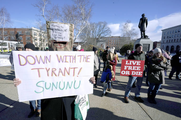 In this Jan. 7 file photo, people protest outside the Statehouse in Concord, N.H., as Gov. Chris Sununu is inaugurated at noon for his third term as governor. (AP Photo/Charles Krupa)