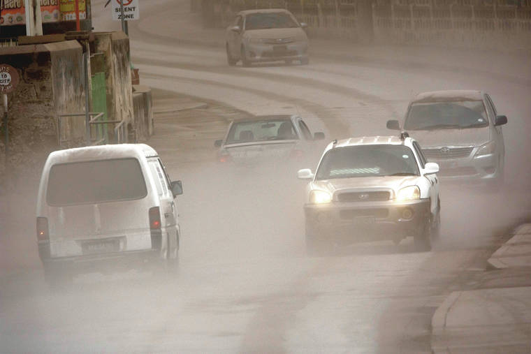 Vehicles drive on the main Black Rock road, covered with ash coming from the St. Vincent eruption of La Soufriere volcano, on Sunday in Bridgetown, Barbados. (AP Photo/Chris Brandis)