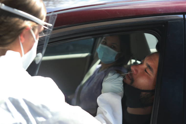 KELSEY WALLING/Tribune-Herald Donovan Josue-Maa is tested for COVID-19 by Jordyn Pacheco with S&G Labs at Afook-Chinen Civic Center in Hilo on Wednesday, April 14, 2021.