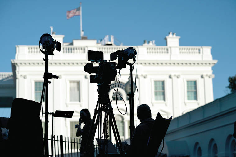 FILE - In this Nov. 4, 2020, file photo journalists gather outside the White House in Washington. A new study of people’s attitudes toward the press finds that distrust goes deeper than just partisanship and down to how journalists define their mission. Americans want their journalists to be more than watchdogs. (AP Photo/Evan Vucci, File)