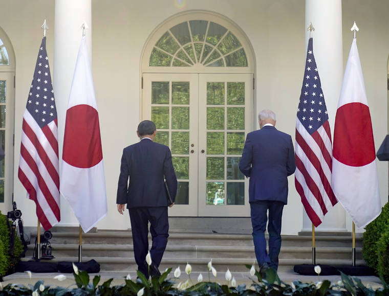 At a news conference in the Rose Garden after their meeting, Biden stressed U.S. commitments to Japan’s defense and said the alliance — the U.S. is Japan’s only treaty ally — would “prove that democracies can still commit and win” and “deliver for our people.”