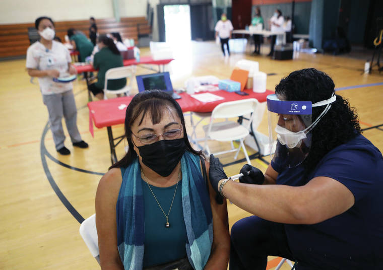 Kelsey Walling/Tribune-Herald Iwalani Kalima receives the first dose of the Moderna COVID-19 vaccine during Bay Clinic’s vaccination event in Keaukaha on Saturday, April 17, 2021.