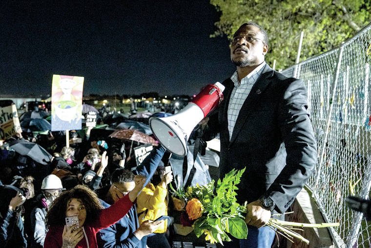 Michael Odiari leads a chant as he attempts to deescalate an altercation between demonstrators and police during a protest decrying the shooting death of Daunte Wright outside the Brooklyn Center Police Department, Friday, April 16, 2021, in Brooklyn Center, Minn. (AP Photo/John Minchillo)