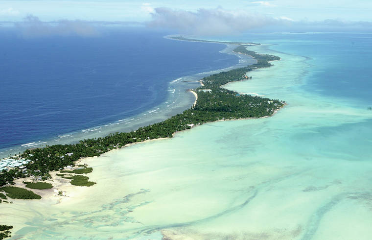 FILE - This March 30, 2004, file photo, shows Tarawa atoll, Kiribati. Ioane Teitiota and his wife fought for years to be allowed to stay in New Zealand as refugees, arguing that rising sea levels caused by global warming threaten the very existence of their tiny Pacific nation of Kiribati, one of the lowest lying countries on Earth. (AP Photo/Richard Vogel, File)
