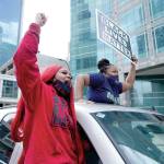 In Houston’s Third Ward, the historically Black neighborhood where Floyd grew up, a small crowd gathered under a tent near a mural of Floyd to listen as the verdict was read on TV. People driving by honked their car horns and yelled, “Justice!”