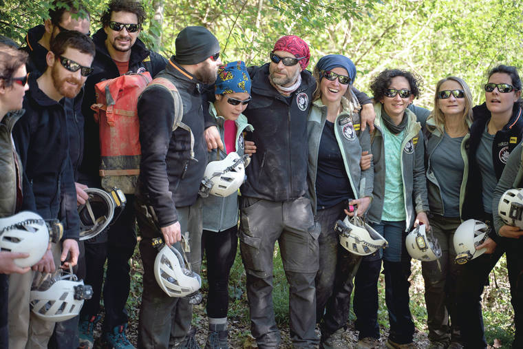 Members of the French team that participated in the "Deep Time" study pose for a photo after exiting the Lombrives Cave in Ussat les Bains, France, Saturday. (AP Photo/Renata Brito)