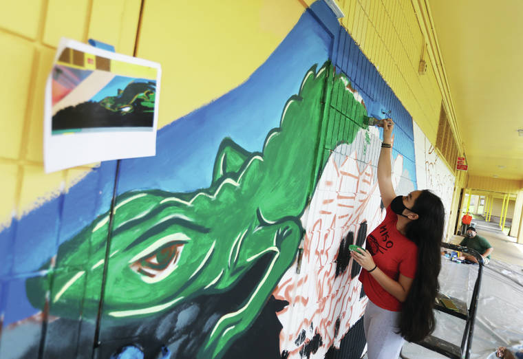 Kelsey Walling/Tribune-Herald Sachiko Kurashima-Schutz paints the tail of a lizard while painting a mural at Pahoa High School on Tuesday, April 27, 2021. Mele Murals helped create the concept of the mural and is overseeing the students as they paint the project.