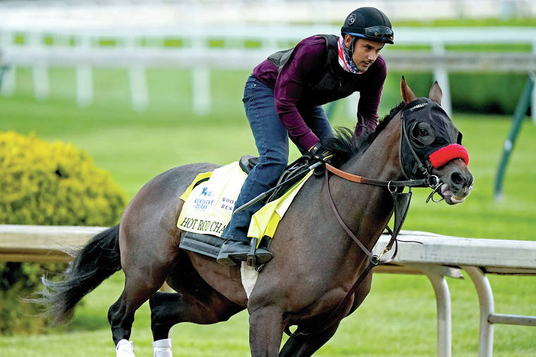 Kentucky Derby entrant Hot Rod Charlie works out at Churchill Downs Wednesday, April 28, 2021, in Louisville, Ky. (AP Photo/Charlie Riedel)