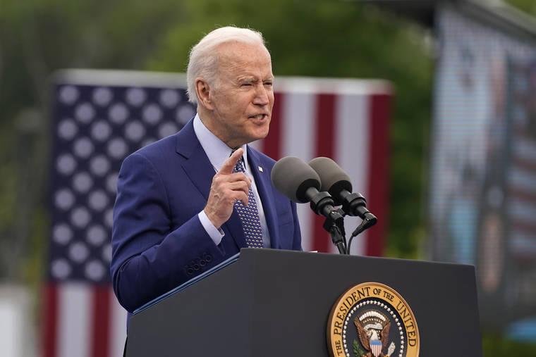 FILE - President Joe Biden speaks during a rally at Infinite Energy Center, to mark his 100th day in office, Thursday, April 29, 2021, in Duluth, Ga. On Friday, April 30, The Associated Press reported on stories circulating online incorrectly claiming Biden’s plan to combat climate change will require Americans to limit their meat consumption by 90%, to just 4 pounds of red meat annually or one hamburger per month. (AP Photo/Evan Vucci, File)