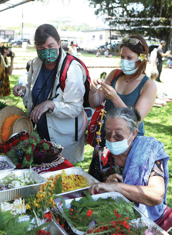 Volunteers monitored the amount of people inside the Hilo park at all times. The smaller crowd was able to socially distance while learning how to make lei or listening to music from Ben Kaili and his band.