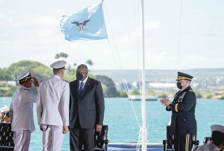 Speaking with the USS Arizona Memorial and the Battleship Missouri Memorial in the background, Austin cautioned that the U.S. military cannot be satisfied with believing it is the strongest and most capability military in the world today — “not at a time when our potential adversaries are very deliberately working to blunt our edge.” He appeared to be referring to China, which other officials say has accelerated its military modernization and sped up its construction of a wide range of sophisticated weaponry while the U.S. was focused for two decades on combatting extremist groups like al-Qaida in Afghanistan and, more recently, the Islamic State group in Iraq and Syria.