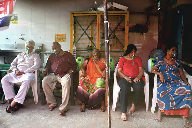 COVID-19 patients receive oxygen Saturday outside a Gurdwara, a Sikh house of worship, in New Delhi, India. (AP Photo/Amit Sharma)
