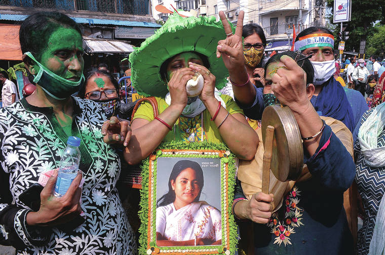Supporters of Trinamool Congress party chief Mamata Banerjee celebrate her early lead for the party in the West Bengal state elections Sunday in Kolkata, India. (AP Photo/Ashim Paul)