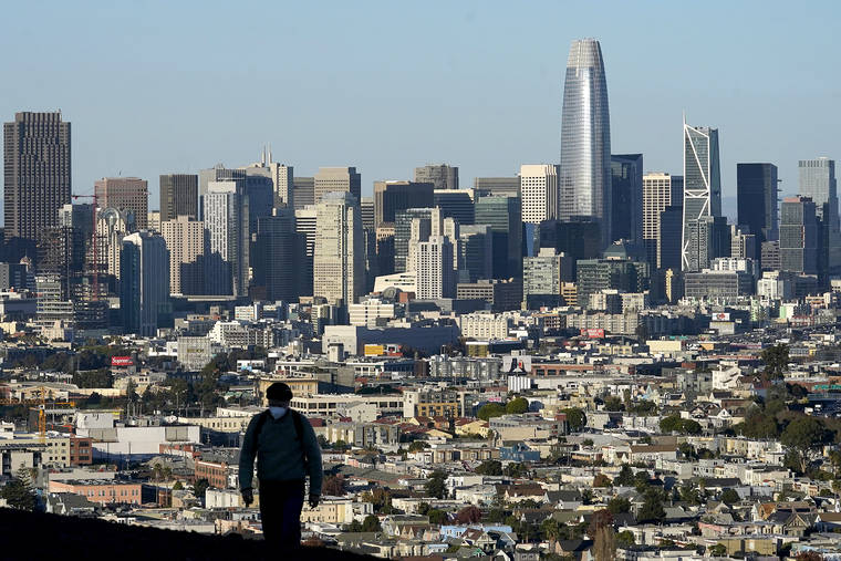 In this Dec. 7 file photo, a person wearing a protective mask walks in front of the skyline on Bernal Heights Hill during the coronavirus pandemic in San Francisco. (AP Photo/Jeff Chiu, File)