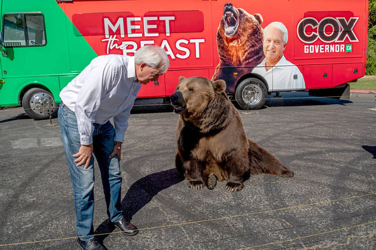 Tag, as the 9-year-old bear is called, had no choice but to be rented out for the kickoff of Republican John Cox’s long-shot bid to replace Gov. Gavin Newsom should the recall campaign succeed. Cox, on the other hand, deliberately gave his bus tour the hokey handle “Meet the Beast,” which is supposed to play off Cox’s promise to be a tough beast of a governor. Like that’s really the image a 65-year-old man wants to go for when he’s running for office these days?