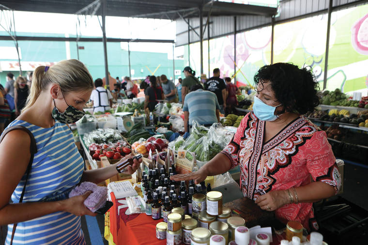 Kelsey Walling/Tribune-Herald Myhanh Nguyen, center, pays for fruit at the Hilo Farmers Market Saturday.